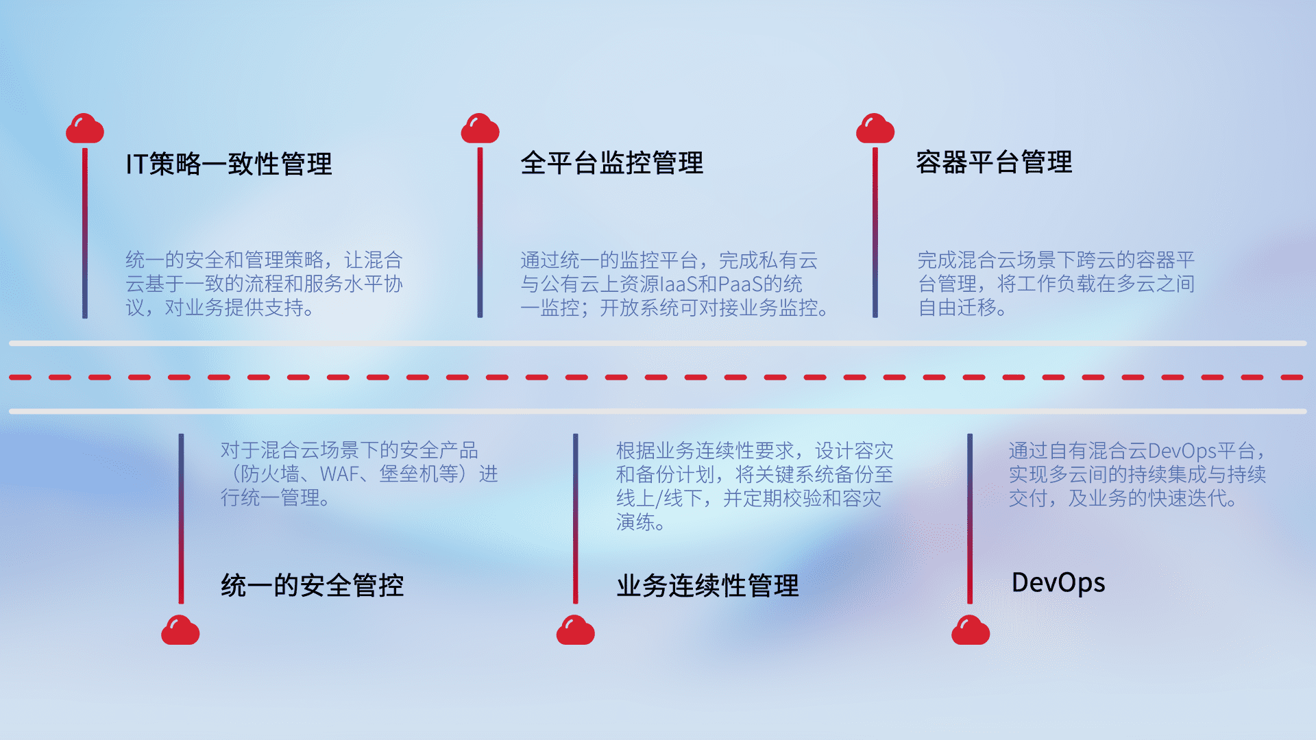 通过多云纳管,,以统一的资源数据模型把客户的云资源进行抽象和封装,,,进而实现对多云资源的统一操作,,保障云资源管理的可靠性、、稳定性与可用性。。量身定制化运维内容,,,,配置、、开发运维、、、补丁管理、、、、备份、、监控、、、认证和访问管理、、、、审计和日常巡检等,,保障在用云过程中的可靠度,,,,稳定度以及高可用率。。
