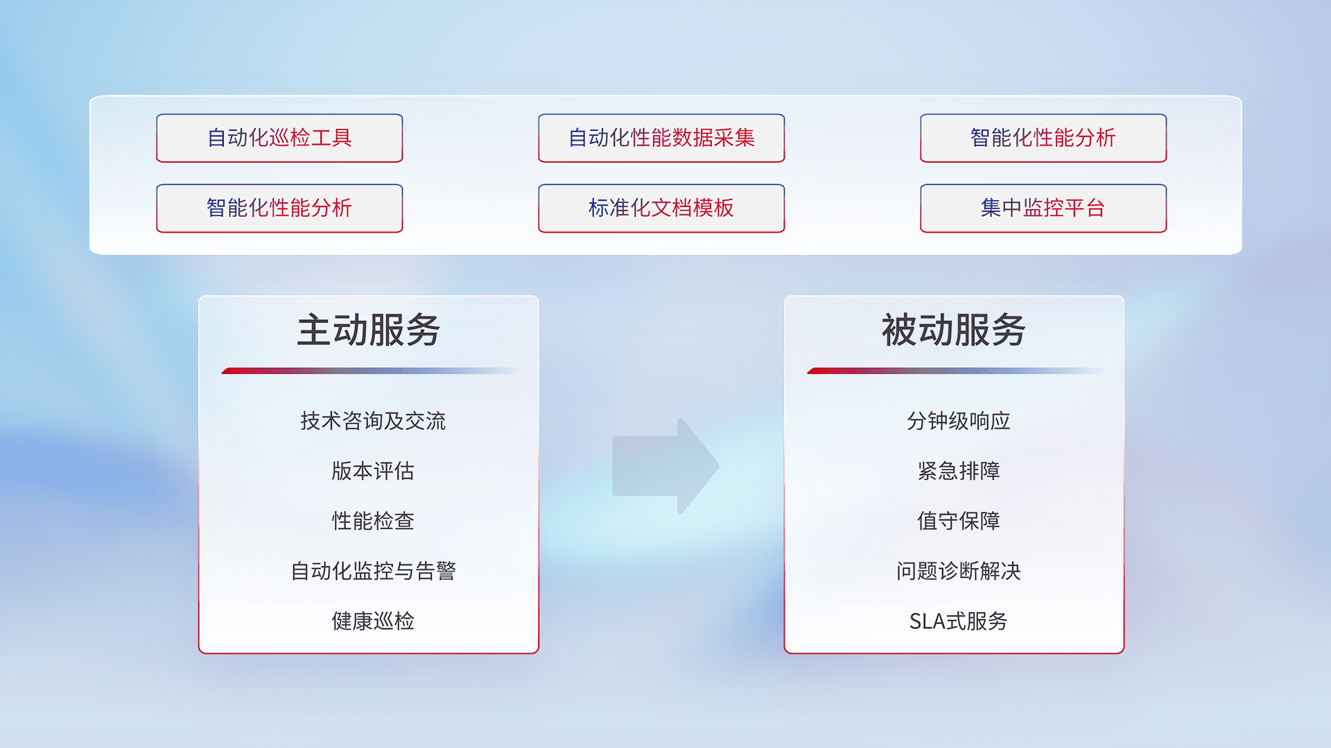 智能化工具和标准化文档,,,,保障服务质量,,,提供主动服务(包含技术咨询、、、版本评估、、、、性能检查、、自动化监控与告警、、、健康巡检)和被动服务包含(分钟级响应、、紧急排障、、值守保障、、问题诊断解决、、SLA服务)。。。。